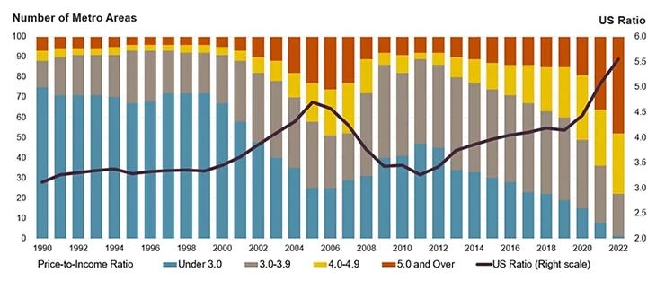 The chart below only goes to 2022, and it has come down a small amount in 2023, but we're still in the same red zone. To make a realistic change in this curve we need more housing supply. The US needs about 1mill new homes per year to keep up with new demand and older homes passing out of useful life. We spent most of 2008 to 2016 falling far short of that 1mill new home starts mark, leading to a worsening lack of inventory since then. In order to build cheaply we need cheaper labor and materials. I don't see that happening until we have a significant recession.