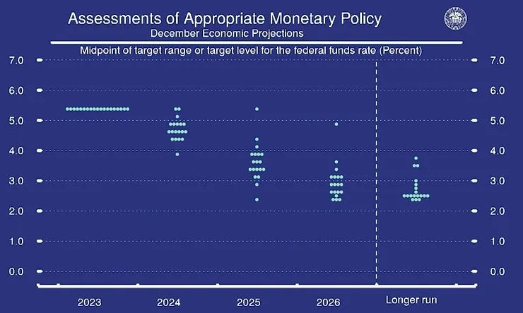 Today the Federal Reserve (Papa Powell himself) laid out a plan for cutting rates three time next year and three to four times in 2025 - with a target of around 2.0% to 2.5%. If you want to skip all of the interpretation and news filters placed on top, you can watch all 45 minutes of it - for you finance nerds out there. Just in case that sounds like too much sunshine and rainbows, he said multiple times that they were committed to their inflation target of 2.0% to 2.5%. So tightening could still happen in the future. It's easy to hear what you want to hear and skip all of those escape clauses, so this is not a forgone conclusion. The planned rate drop as seen in this chart is what I would call the 'happy path.'