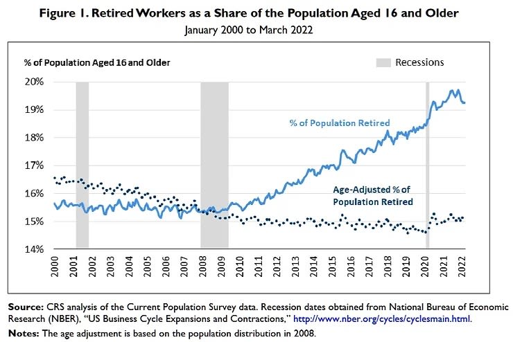 Alright - this newsletter is about Real Estate, right? Yes, here you go! The ability to buy houses is all about jobs. So let's look at the state of work in America. The pandemic was certainly a turning point. Work is now different, and the pandemic was a catalyst for many boomers to retire. "The world is ending, might as well do it from the beach, right?" Here is a chart of retired workers as a portion of the population: